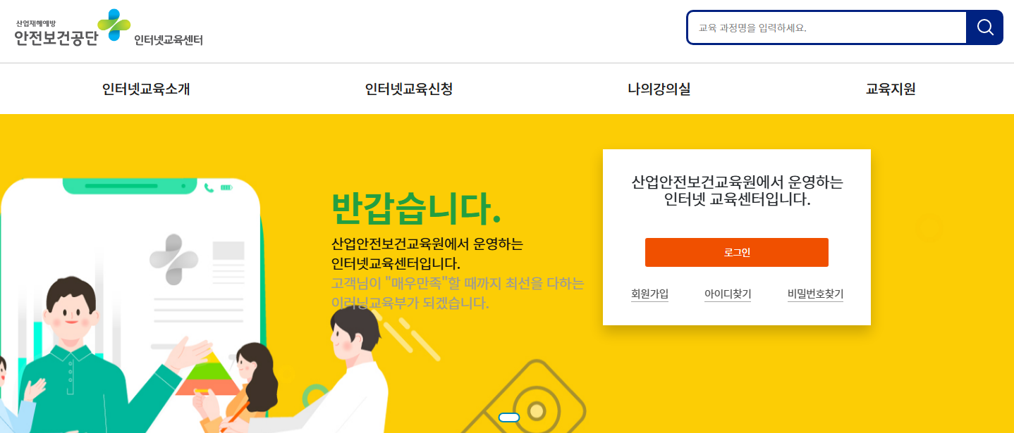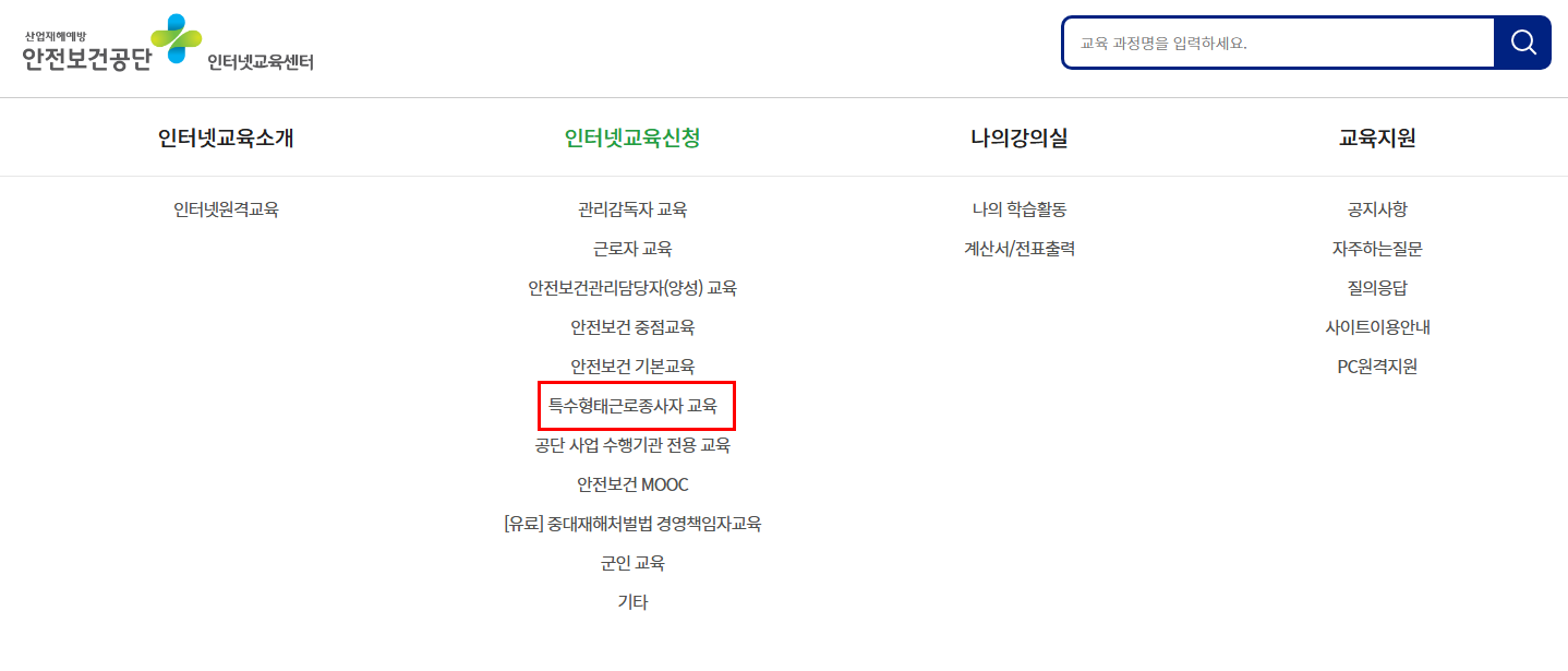 특수형태 근로종사자 안전교육은 안전보건공단 인터넷교육센터(safetyedu.net)에서 신청할 수 있습니다. 교육 신청 절차는 다음과 같습니다: