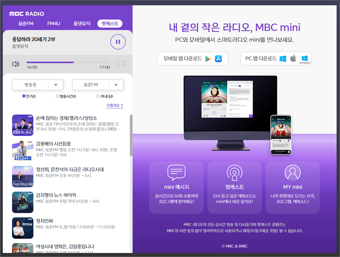 - 별도의 설치 없이 웹앱(https://mini.imbc.com/)을 통해 PC, 모바일 브라우저에서 바로 청취 가능