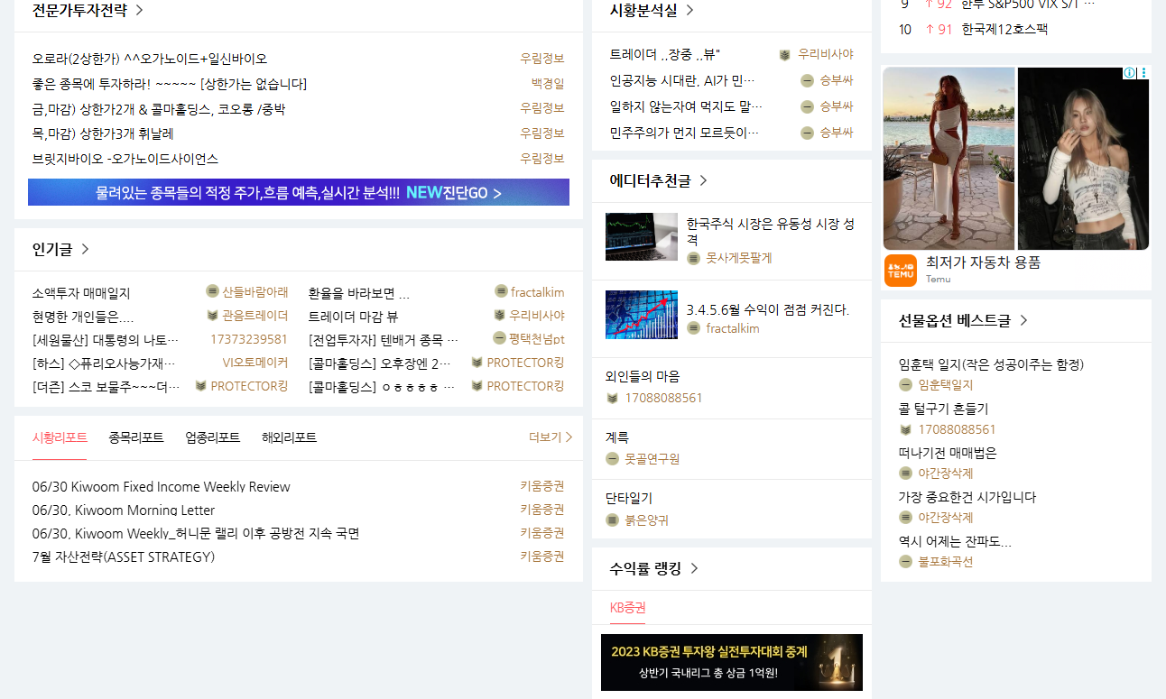 주식 외에도 부동산, 가상자산, 연금, 재테크 등 다양한 분야의 게시판이 운영되며, 사용자의 경험 기반 정보 공유가 활발히 이루어집니다. 특히 투자 초보자들을 위한 질문과 답변 공간이 있어 금융 리터러시 향상에도 기여합니다.