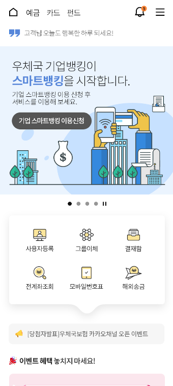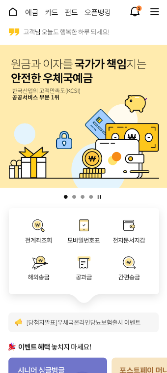 금융상품가입 | 정기예금, 적금, ISA 계좌, 우체국 스마트예금 등 상품가입 가능 |