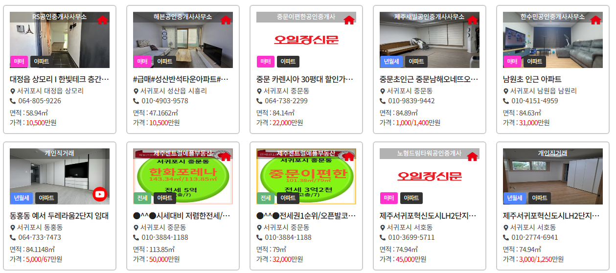 서귀포 지역에서는 원룸, 다세대, 빌라, 아파트 등 다양한 형태의 임대 매물이 제공되며, 특히 관광객을 위한 단기 임대도 활발합니다.