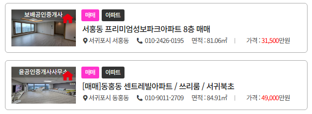 - 제주시 연동: 84.92㎡, 매매 2억 9,000만원