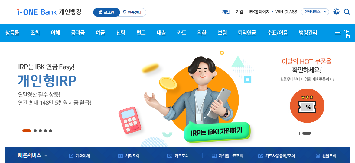 기업은행 개인인터넷뱅킹 홈페이지