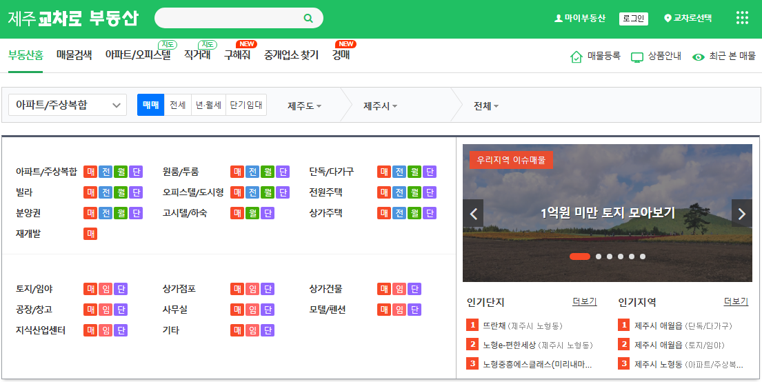 제주 교차로 부동산은 제주도 전 지역의 부동산 매물을 한 곳에서 확인할 수 있는 종합 부동산 정보 사이트입니다. 매매, 전세, 월세 등 다양한 거래 유형의 매물을 제공하며, 개인 직거래부터 공인중개사 매물까지 폭넓은 선택권을 제공합니다.