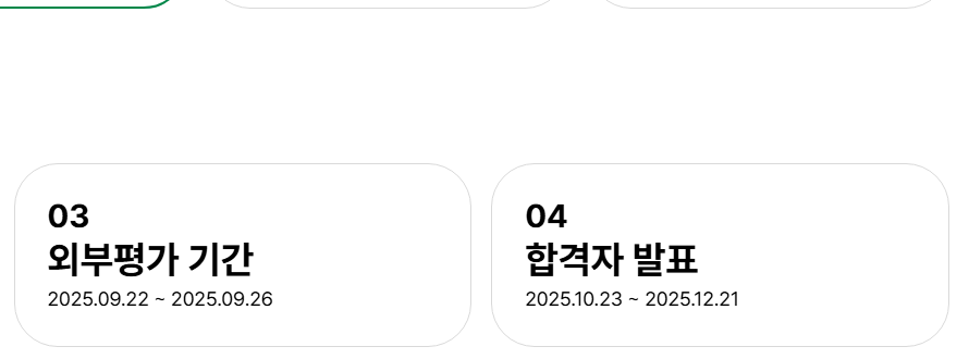 - 3회차: 원서접수 2025.08.25 ~ 2025.08.28, 외부평가 2025.09.22 ~ 2025.09.26, 합격자 발표 2025.10.23 ~ 2025.12.21