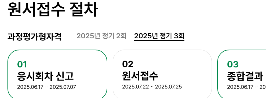 원서접수 절차 과정평가형자격 2025년 정기 3회 2025년 정기 4회 01 응시회차 신고 2025.06.17 ~ 2025.07.07 02 원서접수 2025.07.22 ~ 2025.07.25 03 종합결과 신고 2025.06.17 ~ 2025.08.18 04 외부평가 기간 2025.08.27 ~ 2025