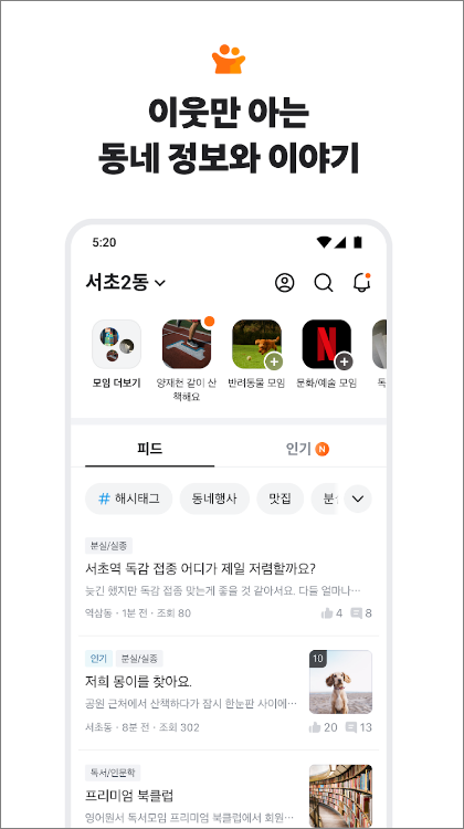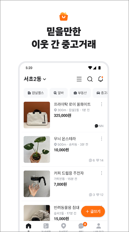 중고 거래부터 동네 정보까지, 이웃과 함께해요. 가깝고 따뜻한 당신의 근처를 만들어요.