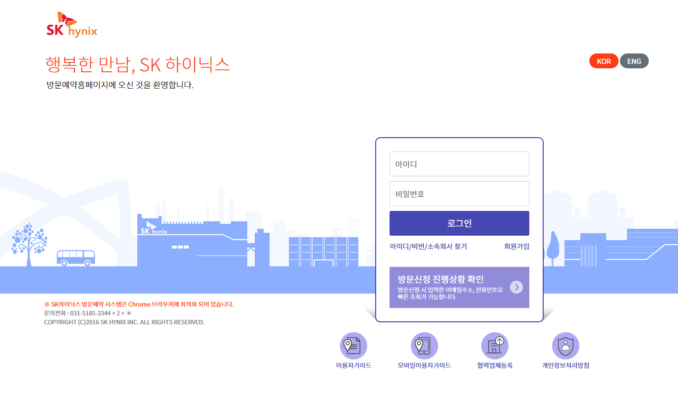 SK하이닉스 방문예약 시스템(welcome.skhynix.com)은 외부 방문객들이 인터넷을 통해 안전하게 방문을 예약하고 내부적으로 효율적인 관리를 할 수 있도록 지원하는 웹 기반 서비스입니다. "행복한 만남, SK하이닉스"라는 슬로건으로 운영되는 이 시스템은 Chrome 브라우저에 최적화되어 있으며, PC와 모바일 환경 모두에서 이용할 수 있습니다.