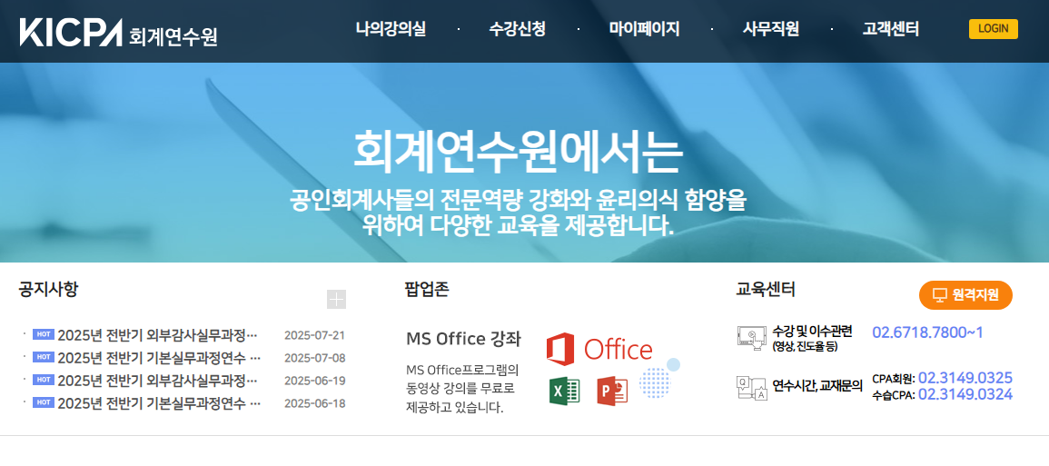 한국공인회계사회 사이버연수원은 공인회계사의 전문성 향상과 윤리의식 함양을 위한 핵심 교육 플랫폼으로, 체계적이고 편리한 온라인 교육 환경을 통해 회계 전문가들의 지속적인 성장을 지원하고 있습니다.