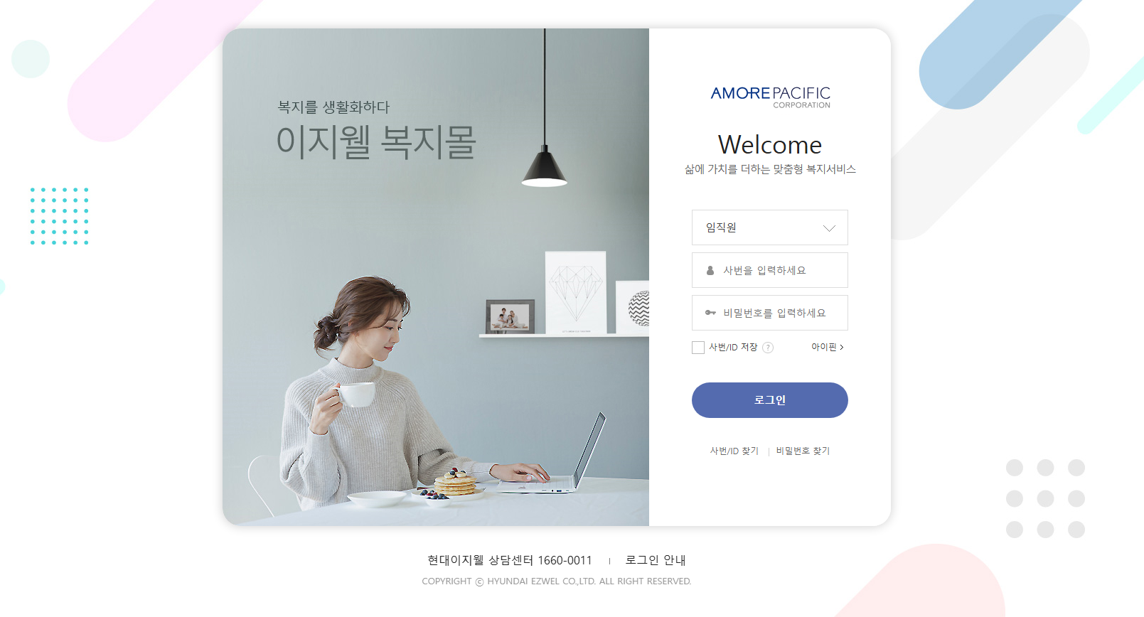 이 서비스는 아모레퍼시픽의 모든 임직원이 이용할 수 있으며, 인사시스템에서 발급받은 임직원 번호와 비밀번호를 통해 접속할 수 있습니다. 웰빙센터라는 명칭에서 알 수 있듯이, 단순한 구매 플랫폼을 넘어서 직원들의 전반적인 삶의 질 향상을 목표로 하고 있습니다.